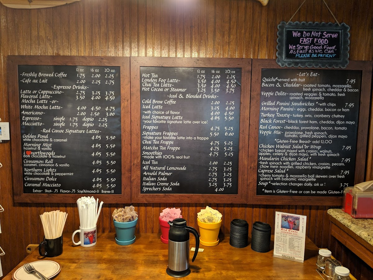 In conclusion, the menu at Red Canoe Coffee & Cocktails offers a warmly simple yet satisfying range of drinks that cater to coffee lovers and casual sippers alike. The beverage list highlights classics such as a 12 oz Cafe Latte for $2.50, 16 oz for $3.00, and 20 oz for $3.50, alongside the 12 oz Flavored Latte for $3.00, 16 oz for $3.50, and 20 oz for $4.00. Espresso fans can enjoy a 12 oz Cappuccino for $2.50, 16 oz for $3.00, and 20 oz for $3.50, while those craving something sweeter might choose a 12 oz Cafe Mocha for $3.75, 16 oz for $4.00, and 20 oz for $4.25, or a cozy 12 oz Hot Cocoa Steamer for $2.50, 16 oz for $3.00, and 20 oz for $3.50. Other favorites such as Chai Latte and Caramel Macchiato, as well as blended Frappes, round out the drink selection with varied sizes and price points that make this spot a welcoming choice for morning pick‑me‑ups or relaxed afternoons in St Germain.